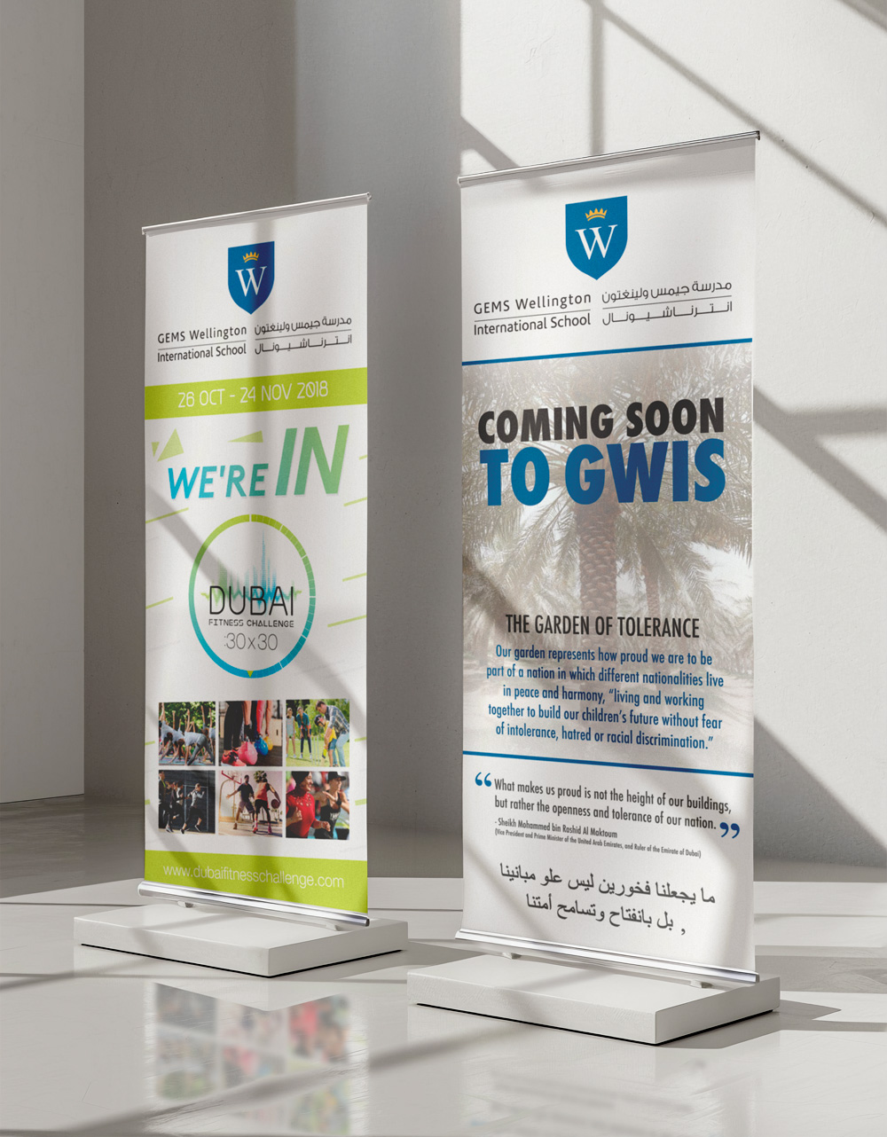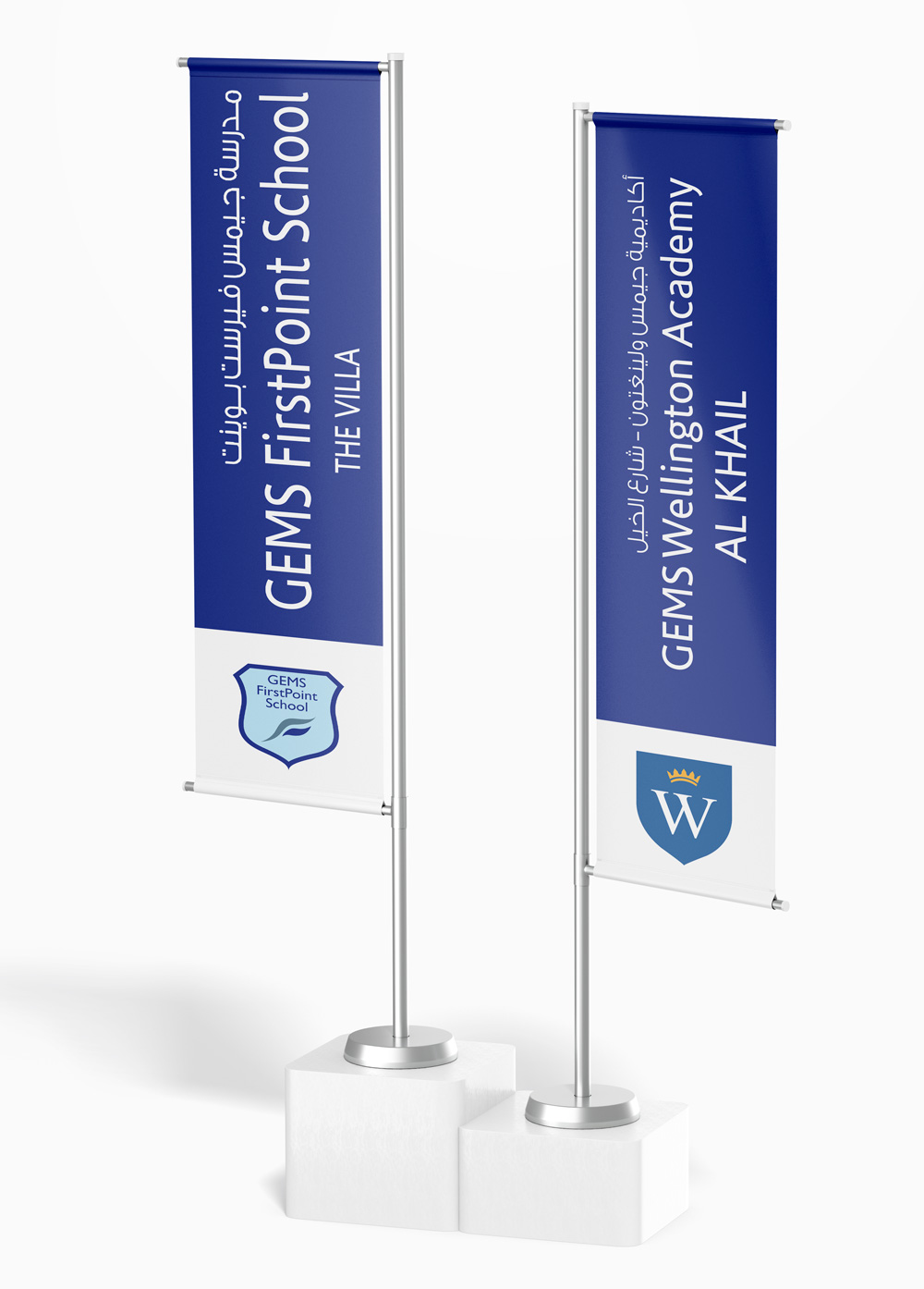 We support GEMS Wellington International School with essential school designs including name badges, trophy and medal designs, roll-up flags, and other branded materials that celebrate achievement and strengthen school identity.